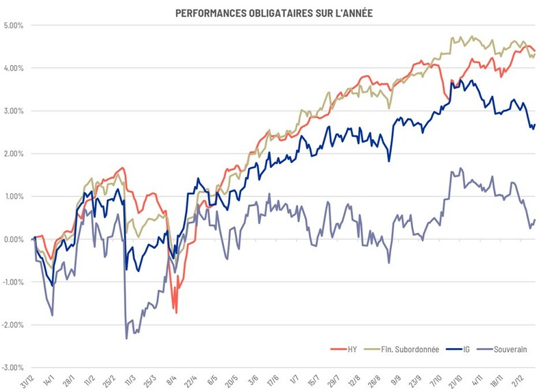 Les marchés de crédit ont ainsi évolué de manière remarquablement stable. Les entreprises, notamment en Europe, sont restées prudentes face à une incertitude économique persistante, tandis que la demande des investisseurs, même si une grande partie des volumes de rotations de portefeuille s’est tournée vers les actions ou des actifs plus risqués pour retrouver des espérances de rendement plus élevées, est restée solidement ancrée sur le crédit corporate. Les obligations souveraines européennes, en revanche, demeurent, logiquement le parent pauvre des allocations : des rendements encore faibles, une volatilité non négligeable et des risques budgétaires latents rendent le couple rendement/risque encore peu séduisant, en particulier sur les maturités longues, malgré le retard accumulé encore cette année. En revanche, nous garderons en tête les obligations d’Etat américaines (cf. hebdo du 21/11/2025) qui nous semblent, par leur rendement plus élevé (non couvert du risque de change), la latitude budgétaire largement plus importante du gouvernement et la puissance économique et politique du pays, une protection à envisager dans un portefeuille face aux risques en présence pour 2026.
